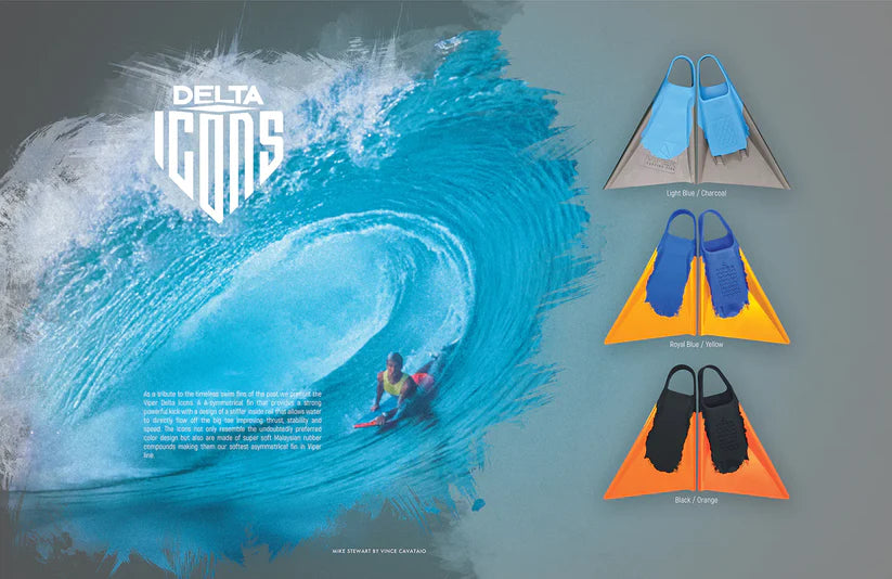 O Viper Delta Icons é uma nadadeira assimétrica e que proporciona remada curta e muito poderosa. A engenharia de sua barbatana mais rígida na parte interna faz com que o fluxo de água se direcione para a região do dedão do pé, garantindo assim um enorme controle, com o máximo de força no momento da remada.